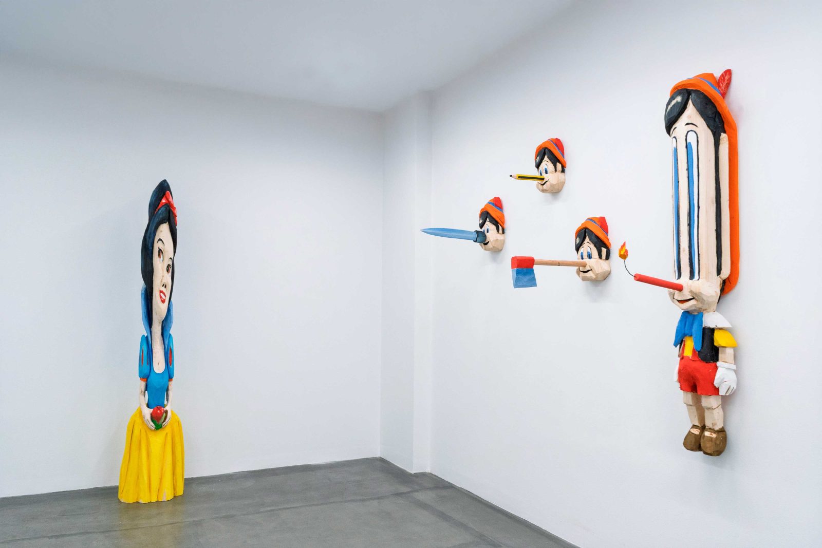 El eje del proyecto es la pintura como lenguaje expansivo —abierto a la escultura, el vídeo o la instalación—, pero en esta ocasión la madera es la gran protagonista. Miyares presenta un conjunto de esculturas talladas a partir de bloques macizos en las que la deformación y el humor articulan un lenguaje propio.